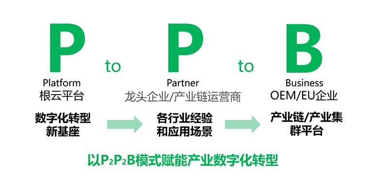 树根互联对客户的服务不仅仅是提供平台,更要助力用户完成数字化转型。在发展之初,树根互联主要是通过服务行业头部客户,如三一重工、卫华重工等来孵化行业模型,从而获得可复制的行业服务能力。随着实践经验的不断积累,树根互联更加注重强调通过“平台+行业解决方案+生态能力”来服务广大终端制造企业,并创新性地提出了P2P2B模式,即通过Platform(平台),去支持和服务Partner(伙伴),帮助制造企业的龙头企业和产业互联网的创新企业,以及生态伙伴,协助他们去构建行业的解决方案和服务能力,最终服务终端客户Business(业务)。