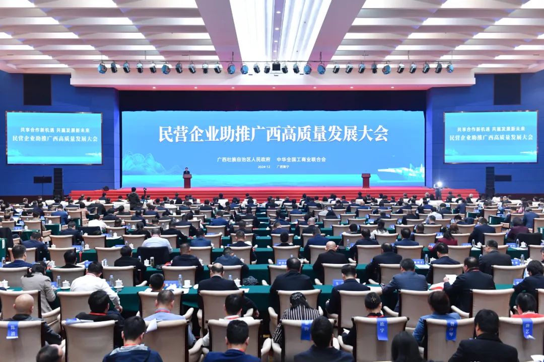 刘宁表示,民营经济是推进中国式现代化的生力军,支持民营经济发展是党中央的一贯方针。广西深入学习贯彻习近平总书记关于民营经济发展的重要论述和关于广西工作论述的重要要求,始终坚持“两个毫不动摇”“三个没有变”,想方设法支持民营经济发展,深层次优服务解难题,全链条强保障提质效,多渠道搭平台聚合力,着力打造政务、要素、法治、市场、创新“五大环境”,民营经济持续发展壮大,成为支撑广西高质量发展的中坚力量。去年全国工商联“万家民营企业评营商环境”调查结果显示,广西是我国营商环境进步明显的五个省区之一。我们将以举办这次大会为契机,深入学习贯彻党的二十大和二十届二中、三中全会以及中央经济工作会议精神,进一步优化民营经济发展环境,同广大民营企业和企业家一道分享建设新时代壮美广西的宏大场景,一起打造国内国际双循环市场经营便利地,携手共建以沿边临港产业园区为统领的各类园区,协力构建面向东盟的跨境跨区域产业链供应链体系,携手并肩、齐心协力,促进民营经济加快做大做优做强,共创共享民营企业助推广西高质量发展的美好未来。