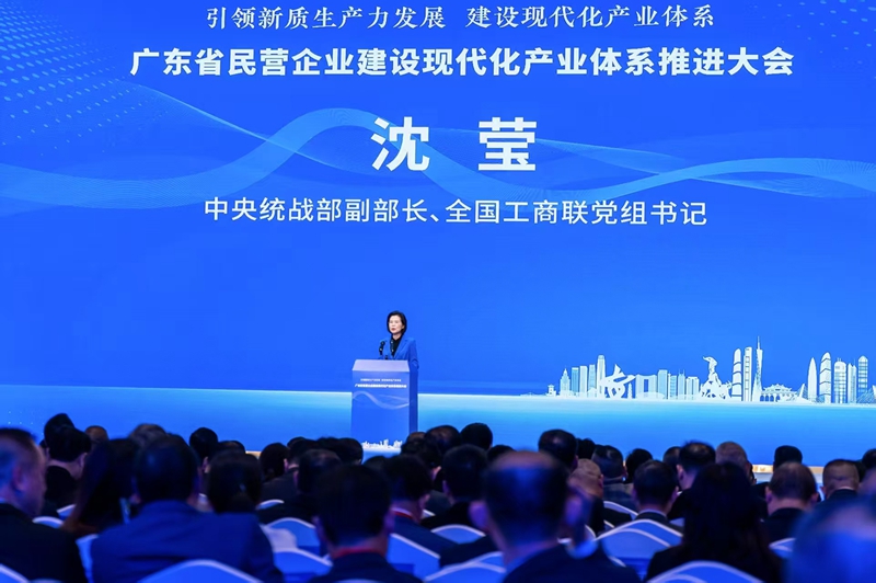 2月24日,以“引领新质生产力发展 建设现代化产业体系”为主题的广东省民营企业建设现代化产业体系推进大会在东莞召开,中央统战部副部长、全国工商联党组书记沈莹出席会议并讲话。
