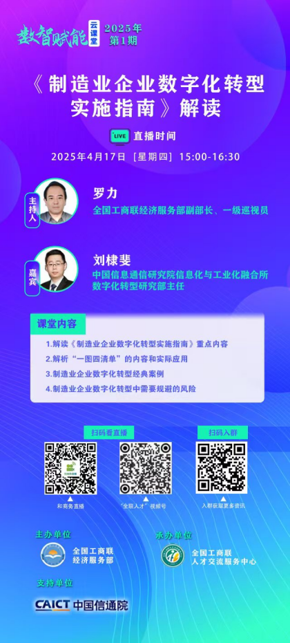2025年“数智赋能云课堂”第1期“《制造业企业数字化转型实施指南》解读”4月17日开播
