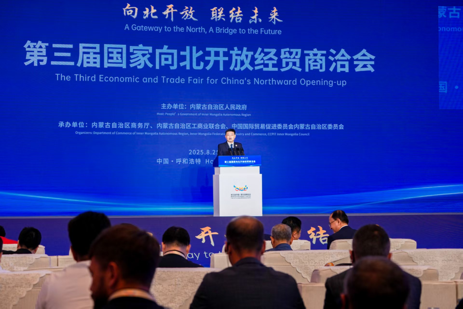 8月25日,第三届国家向北开放经贸商洽会在呼和浩特市隆重开幕。本次大会以“向北开放 联结未来”为主题,来自蒙古国、俄罗斯等16个国家和地区的300余位政商界代表、国内外重点企业及商协会代表齐聚一堂,围绕扩大对外开放、推进高质量发展、实现互利共赢多个领域展开深入洽谈。内蒙古自治区人民政府副主席杨进、商务部副部长鄢东、全国工商联副主席李冰出席并致辞。