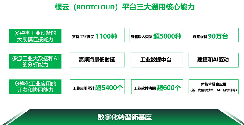 目前,根云平台已经形成三大通用核心能力,即:多种类工业设备的大规模连接能力,多源工业大数据和AI的分析能力,以及多样化工业应用的开发和协同能力。